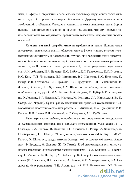 Степень научной разработанности проблемы и темы. Используемая литература относится к разным областям философского знания, текстам художественной литературы и богословских трудов.Для раскрытия темы диссертации иобоснования ее основных идей немаловажное значение имеют работы о личности, ее Я, ценностях, конструировании Я, самоопределении, идентичности (А.К. Абишева, Н.А. Бердяев, В.С. Библер, Д.Л. Григоренко, П.С. Гуревич, И.С. Кон, Т.П. Лифанцева, И.В. Милицина, В.С. Невелева, Н.С. Петренко, П. Рикер, И.Н. Степанова, Е.Г. Трубина, Е.О. Труфанова, Г.Л. Тульчинский, В. Франкл, В. Хесле, Н.Л. Худякова, С.М. Шалютин,) и работы, рассматривающие проблематику Я-Другой (М.М. Бахтин, Н.А. Бердяев, М. Бубер, Е.К. Краснухина, Э. Левинас, В.Г. Лысенко, Г. Марсель, М. Монтень, С.А. Никольский, Ж.-П. Сартр, С.Л. Франк,). Среди работ, посвященных проблеме самосознания и самопознания, необходимо отметить работы Б.Г. Ананьева, Н.А. Бухариной, И.В. Ватина, И.В. Ежова, В.П. Ивановой, А.С. Спиркина, А.И. Субботина.