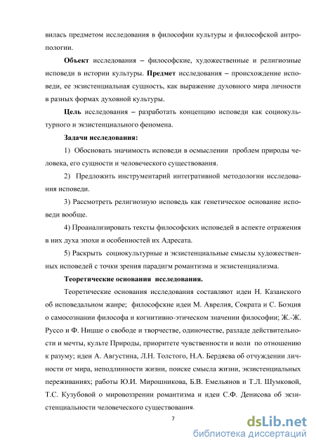 Теоретические основания исследования составляют идеи Н. Казанского об исповедальном жанре; философские идеи М. Аврелия, Сократа и С. Боэция о самосознании философа и когнитивно-этическом значении философии; Ж.-Ж. Руссо и Ф. Ницше о свободе и творчестве, одиночестве, разладе действительности и мечты, культе Природы, приоритете чувственности и воли по отношению к разуму; идеи А. Августина, Л.Н. Толстого, Н.А. Бердяева об отчуждении личности от мира, неподлинности жизни, поиске смысла жизни, экзистенциальных переживаниях; работы Ю.И. Ми-рошникова, Б.В. Емельянов и Т.Л. Шумковой, Т.С. Кузубовой о мировоззрении романтизма и идеи С.Ф. Денисова об экзистенциальности человеческого существования.