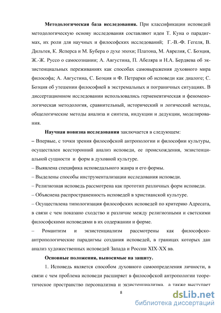 Методологическая база исследования. При классификации исповедей методологическую основу исследования составляют идеи Т. Куна о парадигмах, их роли для научных и философских исследований; Г.-В.-Ф. Гегеля, В. Дильтея, К. Ясперса и М. Бубера о духе эпохи; Платона, М. Аврелия, С. Боэция, Ж.-Ж. Руссо о самосознании; А. Августина, П. Абеляра и Н.А. Бердяева об экзистенциальных переживаниях как способах самовыражения духовного мира философа; А. Августина, С. Боэция и Ф. Петрарки об исповеди как диалоге; С. Боэция об утешении философией в экстремальных и пограничных ситуациях. В диссертационном исследовании использовались герменевтическая и феноменологическая методология, сравнительный, исторический и логический методы,общелогические методы анализа и синтеза, индукции и дедукции, моделирования.