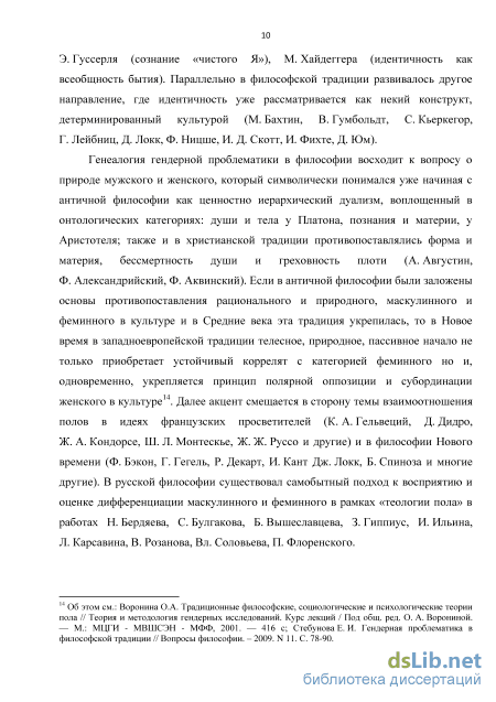 Степень научной разработанности проблемы. Генеалогия тендерной проблематики в философии восходит к вопросу о природе мужского и женского, который символически понимался уже начиная с античной философии как ценностно иерархический дуализм, воплощенный в