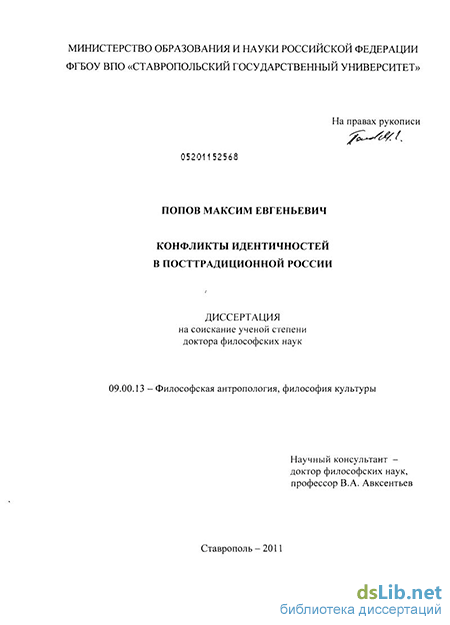 Цель диссертационного исследования – концептуализация конфликтов идентичностей как парадигмы объяснения социокультурных трансформаций в посттрадиционной России с позиций философской антропологии и философии культуры.