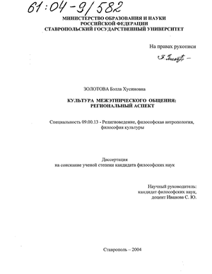 В Ставропольском государственном университете в рамках научного направления кафедры социальной философии и этнологии были защищены диссертационные исследования А.Б. Багдасаровой, СЮ. Ивановой, О.В. Ляшенко, М.А. Ягьяевой, в которых рассматриваются различные аспекты формирования культуры межэтнического общения.