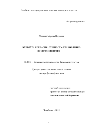 В диссертационном исследовании разработана концепция культуры согласия в е сущности, истоках (предпосылках), начале и воспроизводстве.
