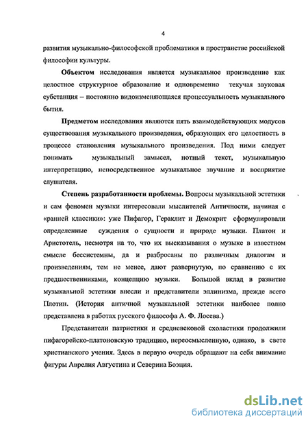 Степень разработанности проблемы. Вопросы музыкальной эстетики и сам феномен музыки интересовали мыслителей античности начиная с «ранней классики»: уже Пифагор, Гераклит и Демокрит сформулировали определенные суждения о сущности и природе музыки. Платон и Аристотель, несмотря на то, что их высказывания о музыке в известном смысле бессистемны, да и разбросаны по различным диалогам и трактатам, тем не менее, дают развернутую, по сравнению с их предшественниками, концепцию музыки. Большой вклад в развитие музыкальной эстетики внесли и представители эллинизма, прежде всего Плотин. (История античной музыкальной эстетики наиболее полно представлена в фундаментальных работах А. Ф. Лосева.)