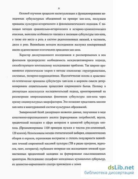 Характер диссертационного исследования и рассматриваемых в нем феноменов предопределил необходимость междисциплинарного подхода, способствующего комплексному исследованию проблемы. Так широко применяются стратегические теории и методы социологии: структуралистские, системные, эмпирико-корреляционные. Идеологическая основа и нравственно-эстетические принципы субкультуры хип-хопа в широком смысле детерминированы социетальными процессами современного бытия. Поэтому в диссертации используется исследовательский подход, ориентированный на рассмотрение микросоциальных феноменов субкультуры хип-хопа через призму социокультурных макрофакторов. Это позволяет представить миссию хип-хопа в многоуровневой системе культурных образований.