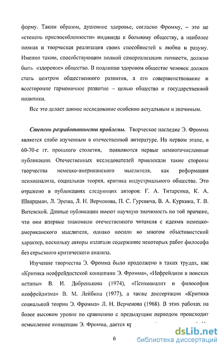 Степень разработанности проблемы. Творческое наследие Э. Фромма является слабо изученным в отечественной литературе. На первом этапе, в 60-70-е гг. прошлого столетия, появляются первые немногочисленные публикации. Отечественных исследователей привлекали такие стороны творчества немецко-американского мыслителя, как реформация психоанализа, социальная теория, критика индустриального общества. Это отражено в публикациях следующих авторов: Г. А. Титаренко, К. А. Шварцман, Л. Эрсша, Л. Н. Верчснова, П. С. Гуревича, В. А. Куркина, Т. В. Витсвской. Данные публикации имеют научную значимость по той причине, что они впервые знакомили отечественного читателя с идеями немецко-американского мыслителя, однако носили во многом объктивистский характер, поскольку авторы излагали содержание некоторых работ философа без серьезного критического анализа.
