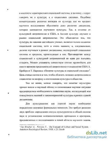 в контексте характеристики социальной системы, и поэтому, следует говорить не о культуре, а о социальных системах. Подобное концептуальное различие взглядов на культуру как на предмет научного исследования обусловило даже различие дисциплин, которые занимаются изучением культуры. Так, в отличие от культурной антропологии в США, в Англии культуру изучают в рамках социальной антропологии. Это объясняется тем, что культура, по мнению английских ученых, является только аспектом социальной системы, хотя и очень важным, а, следовательно, должна изучаться в рамках дисциплины, исследующей социальные системы и процессы, происходящие в них. Противоречие между социологией и культурной антропологией не один раз пытались сгладить. Можно упомянуть совместную статью крупнейших для своего времени представителей антропологии и социологии США А. Кребера и Т. Парсонса «Понятие культуры и социальной системы»4. Цель статьи состояла в том, чтобы сблизить позиции антропологии и социологии по вопросу о соотношении культуры и общества.
