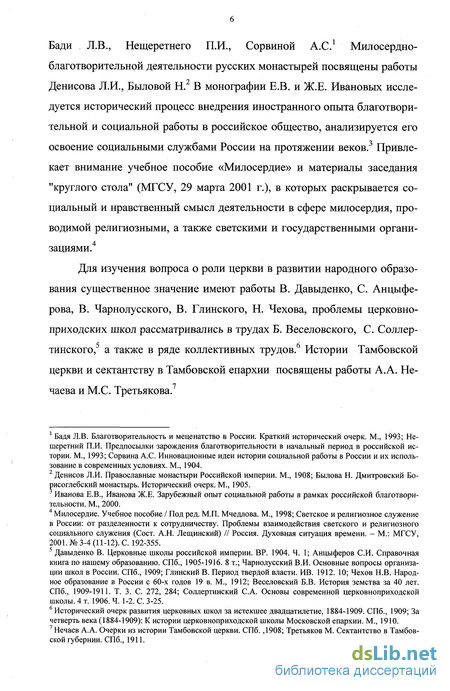 Для изучения вопроса о роли церкви в развитии народного образования существенное значение имеют работы В. Давыденко, С. Анцыфе-рова, В. Чарнолусского, В. Глинского, Н. Чехова, проблемы церковноприходских школ рассматривались в трудах Б. Веселовского, С. Соллер-тинского,5 а также в ряде коллективных трудов.6 Истории Тамбовской церкви и сектантству в Тамбовской епархии посвящены работы А.А. Не-чаева и М.С. Третьякова.