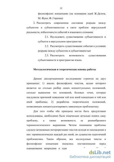 Данное диссертационное исследование строится на двух принципах: 1) анализ философских текстов, целью которого является не столько разбор самих концептуальных положений, сколько выявление тех оснований, болевых точек, которые послужили причиной появления той или иной концепции и той или иной проблемы; 2) разработка теоретических положений, позволяющих концептуализировать заявленную проблематику.