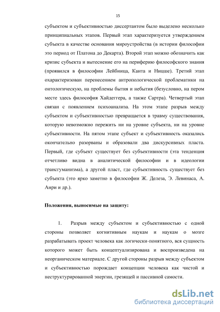 источников и сопутствующей литературы в истории разрыва между субъектом и субъективностью диссертантом было выделено несколько принципиальных этапов. Первый этап характеризуется утверждением субъекта в качестве основания мироустройства (в истории философии это период от Платона до Декарта). Второй этап можно обозначить как кризис субъекта и вытеснение его на периферию философского знания (проявился в философии Лейбница, Канта и Ницше). Третий этап охарактеризован перенесением антропологической проблематики на онтологическую, на проблемы бытия и небытия (безусловно, на пером месте здесь философия Хайдеггера, а также Сартра). Четвертый этап связан с появлением психоанализа. На этом этапе разрыв между субъектом и субъективностью превращается в травму существования, которую невозможно пережить ни на уровне субъекта, ни на уровне субъективности. На пятом этапе субъект и субъективность оказались окончательно разорваны и образовали два дискурсивных пласта. Первый, где субъект существует без субъективности (эта тенденция отчетливо видна в аналитической философии и в идеологии трансгуманизма), а другой пласт, где субъективность существует без субъекта (это ярко заметно в философии Ж. Делеза, Э. Левинаса, А. Анри и др.).