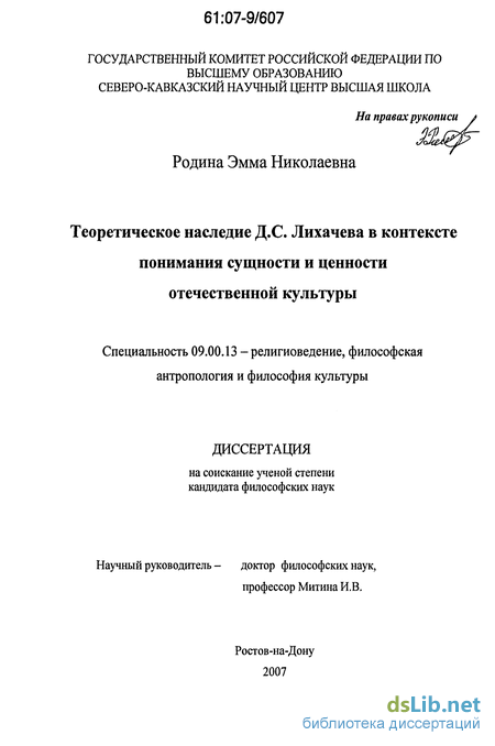 научно-практическая конференция студентов, аспирантов и молодых ученых «Молодежь XXI века - будущее Российской науки» (12-13 мая 2005 года, г. Ростов-на-Дону); а также на заседаниях отдела послевузовской подготовки СКНЦ ВШ. По теме диссертации опубликовано 10 работ. Общий объем публикаций составил 2,5 п.л. По материалам исследования была написана брошюра «Проблемы формирования и функционирования русской культуры в трудах Д.С. Лихачева» для участия в конкурсе 2002 года на лучшую научную студенческую работу по естественным, техническим и гуманитарным наукам в вузах Российской Федерации. Работа была награждена дипломом Министерства образования РФ.