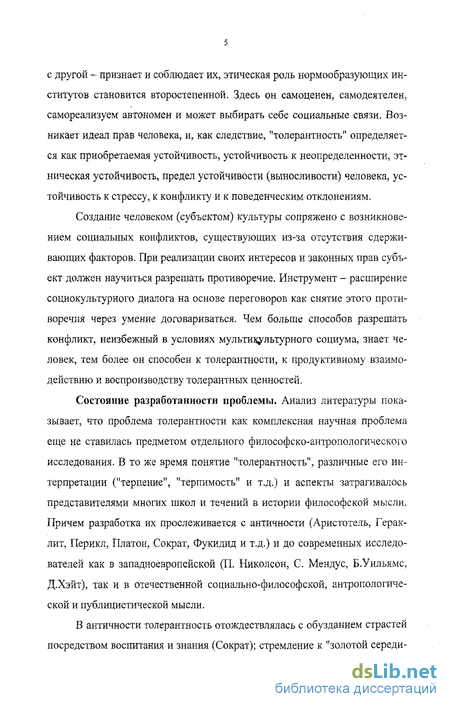 Состояние разработанности проблемы. Анализ литературы показывает, что проблема толерантности как комплексная научная проблема еще не ставилась предметом отдельного философско-антропологического исследования. В то же время понятие "толерантность", различные его интерпретации ("терпение", "терпимость" и т.д.) и аспекты затрагивалось представителями многих школ и течений в истории философской мысли. Причем разработка их прослеживается с античности (Аристотель, Гераклит, Перикл, Платон, Сократ, Фукидид и т.д.) и до современных исследователей как в западноевропейской (П. Николсон, С. Мендус, Б.Уильямс, Д.Хэйт), так и в отечественной социально-философской, антропологической и публицистической мысли.