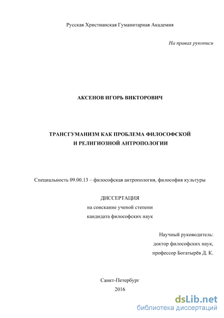 Наконец, поскольку трансгуманизм выступает разновидностью гуманизма, точнее – секулярного гуманизма, сформировавшегося в эпоху Просвещения, необходимо учитывать критический анализ гуманистического и секулярно-гуманистического мировоззрения как такового. В данном случае мы опираемся в первую очередь на классические работы русских философов: Бердяева Н. А., Булгакова С. Н., Вышеславцева Б. П., Франка С. Л., Соловьева В. С. Опорной для нашего исследования является культурологическая концепция Д. К. Богатырева, построенная на обобщении антропологических и культурфилософских идей русских религиозных философов.
