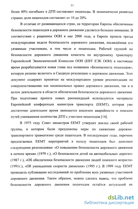 В отличие от развивающихся стран, на территории Европы обеспечению безопасности пешеходов в дорожном движении уделяется большое внимание. В соответствии с решением ООН в мае 2000 года, в Европе прошла третья международная неделя безопасности дорожного движения, посвященная его уязвимым участникам, в том числе и пешеходам. Рабочей группой по безопасности дорожного движения комитета по внутреннему транспорту Европейской Экономической Комиссии ООН (КВТ ЕЭК ООН) в настоящее время разрабатывается новая глава под названием «Безопасность пешеходов», которую решено включить в Сводную резолюцию о дорожном движении. Этот документ содержит принятые на международном уровне рекомендации по совершенствованию как национальных правил дорожного движения, так и в целом деятельности в области обеспечения безопасности дорожного движения. При подготовке проекта новых рекомендаций используются материалы Европейской конференции министров транспорта (ЕКМТ), которая уже достаточно длительное время занимается анализом аварийности и поиском путей уменьшения количества ДТП с участием пешеходов [14].