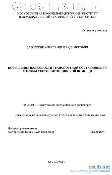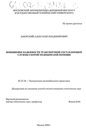Заборский Александр Владимирович. Повышение надежности транспортной составляющей службы скорой медицинской помощи : диссертация ... кандидата технических наук : 05.22.10.- Москва, 2003.- 180 с.: ил. РГБ ОД, 61 03-5/3438-6