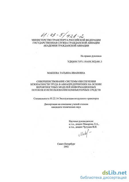 Макеева Татьяна Ивановна. Совершенствование системы обеспечения безопасности труда в авиапредприятиях на основе вероятностных моделей информационных потоков и использования компьютерных средств : диссертация ... кандидата технических наук : 05.22.14.- Санкт-Петербург, 2002.- 184 с.: ил. РГБ ОД, 61 03-5/428-2
