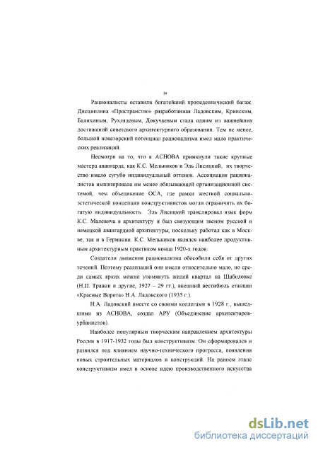 Наиболее популярным творческим направлением архитектуры России в 1917-1932 годы был конструктивизм. Он сформировался и развился под влиянием научно-технического прогресса, появления новых строительных материалов и конструкций. На раннем этапе конструктивизм имел в основе идею производственного искусства A.M. Гана. Он бескомпромиссно отрицал прошлое и выступал против искусства, которое "неразрывно связано с теологией, метафизикой и мистикой" [1.73]. Искусству A.M. Ган противопоставлял социально осмысленные труд, технику и организацию. Конструктивисты заостряли внимание на конструкции и совершенстве техники, которого не существовало, и в этом проявлялась утопическая сторона их концепции.