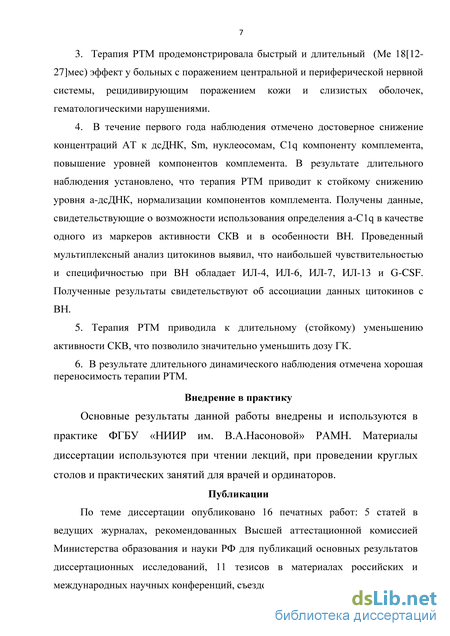 4. В течение первого года наблюдения отмечено достоверное снижение концентраций антител к дсДНК, Sm, нуклеосомам, С1q компоненту комплемента, повышение уровней компонентов комплемента. В результате длительного наблюдения установлено, что терапия РТМ приводит к стойкому снижению уровня а-дсДНК, нормализации компонентов комплемента. Получены данные, свидетельствующие о возможности использования определения а-С1q в качестве одного из маркеров активности СКВ и в особенности ВН. Проведенный мультиплексный анализ цитокинов выявил, что наибольшей чувствительностью и специфичностью при ВН обладают ИЛ-4, ИЛ-6, ИЛ-7, ИЛ-13 и G-CSF. Полученные результаты свидетельствуют об ассоциации данных цитокинов с ВН.