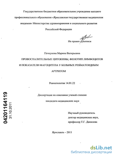 Пачкунова, Марина Валерьевна. Провоспалительные цитокины, фенотип лимфоцитов и показатели фагоцитоза у больных ревматоидным артритом : диссертация ... кандидата медицинских наук : 14.01.22 / Пачкунова Марина Валерьевна; [Место защиты: ГОУВПО "Ярославская государственная медицинская академия"].- Ярославль, 2011.- 170 с.: ил.