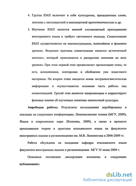 Апробация работы. Результаты исследования апробированы в докладах на следующих конференциях: Ломоносовские чтения (МГУ, 2009), Языки в современном мире (Коломна, 2009), а также в процессе преподавания теории и практики итальянского языка на факультете иностранных языков и регионоведения им. М.В. Ломоносова в 2006-2009 гг.