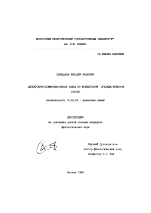 Все статьи, подвергнутые анализу, входят в рубрику, называемую по французской журналистской терминологии articles d opinion. Центральными понятиями для настоящей работы являются : 1. Дискурсивно-коммуникативная рамка высказывания (везде далее сокращенно - ДКР) - совокупность метатекстовых средств, способствующих структурной организации высказывания (дискурса) и его коммуникативной направленности. Это могут быть, например, такие слова и выражения, как Df ABORD, ENSUITE, PASSONS MAINTENANT і..., C EST-A-DIRE, DONC, ENFIN, etc. 2. Публицистический дискурс - разновидность курнально-газетного дискурса, характеризующаяся проблемой общественно-политического характера и соответствующей авторской позицией (ср. у Лаеаро-Карретера: "Публицистичным является любой устный или письменный текст, в котором автор пытается повлиять на общественную позицию" (цит. по Кайда 1989:25). Публицистический дискурс включает в себя все аналитические жанры прессы (редакционную статью, комментарий, полемическую статью, эссе, памфлет (классификация см. Кузнецов 1991), объединяемые в настоящем исследовании под общим названием "Публицистическая Статья" (везде далее сокращенно - ПС). Основным методом исследования стал гипотетико-дедуктиЕный метод, предполагающий сбор фактического материала, построение гипотезы и проверку ее истинности на новых фактах. Анализ литературы по той или иной проблеме в рамках исследования не ограничился только трудами отечественных лингвистов : значительное место в нем заняли работы западноевропейских ученых. В работе приводятся также мнения известных публицистов на предмет целей и задач прессы, что должно обеспечить работе определенный культурологический фон, поскольку проблема выходит за собственно лингвистические рамки. Работа состоит из введения, трех глав и заключения. Первая глава посвящена теоретическим аспектам ДКР. Б ней описывается история вопроса, анализируется структура ДКР и ее специфика и предлагается методика классификации елементов ДКР применительно к ПС. Вся вторая глава посвящена описанию результатов анализа(в парадигматике) элементов ДКР каждого классификационного разряда. Здесь приводятся также теоретические обоснования включения элементов в тот или иной разряд, а также мнения лингвистов о природе того или иного элемента. Третья глава также представляет собой анализ структуры ДКР, но на более высоком, абстрактном уровне(в синтагматическом аспекте), нежели вторая глава. Методика такого анализа дает возможность наглядно представить элементы ДКР в их совокупности на мозаике текста. Данный анализ (2-ая ступень) является органическим продолжением анализа 1-ой ступени, проводимого во второй главе. В заключении излагаются выводы, которые позволило сделать исследование, а также содержатся рекомендации по возможному дальнейшему развитию изысканий в области функционирования ДКР. В конце дается список использованной для написания работы литературы, включающий труды теоретического характера, словари и справочники, а также статьи из периодических изданий, из которых черпался необходимый для анализа явления материал. На защиту выносятся следующие положения: -дискурсивно-коммуникативная рамка есть одно из важных средств структурной организации дискурса вообще и публицистического дискурса в частности. -дискурсивно - коммуникативная рамка п