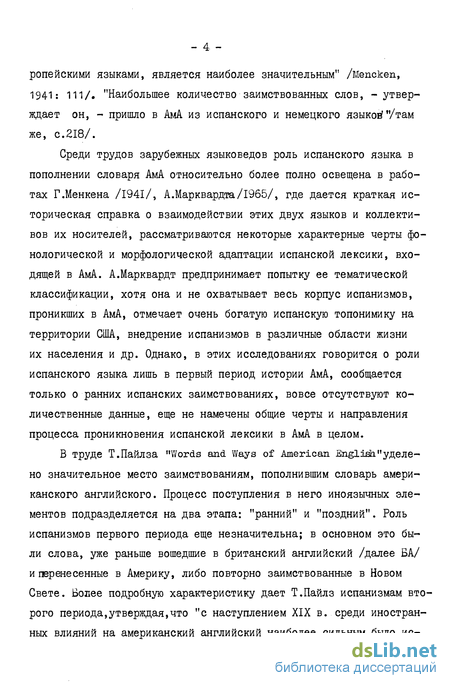 Среди трудов зарубежных языковедов роль испанского языка в пополнении словаря АмА относительно более полно освещена в работах Г.Менкена /I94I/, А.Марквардта/19б5/, где дается краткая историческая справка о взаимодействии этих двух языков и коллективов их носителей, рассматриваются некоторые характерные черты фонологической и морфологической адаптации испанской лексики, входящей в АмА. А.Марквардт предпринимает попытку ее тематической классификации, хотя она и не охватывает весь корпус испанизмов, проникших в АмА, отмечает очень богатую испанскую топонимику на территории США, внедрение испанизмов в различные области жизни их населения и др. Однако, в этих исследованиях говорится о роли испанского языка лишь в первый период истории АмА, сообщается только о ранних испанских заимствованиях, вовсе отсутствуют количественные данные еще не намечены общие черты и направления процесса проникновения испанской лексики в АмА в целом.
