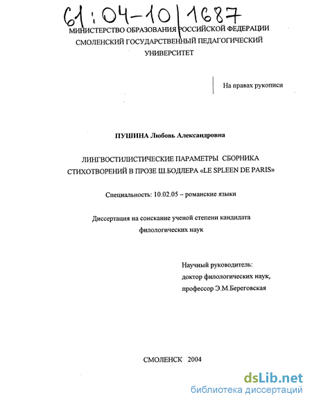 Цель нашего исследования - изучить лингвостилистическое своеобразие текстов стихотворений в прозе Ш.Бодлера «Парижский сплин» с точки зрения тематики, лексики, морфологии, композиции, а также рассмотреть типологические особенности текстов, определяющие индивидуальную формулу жанра «стихотворение в прозе», разработанную Ш.Бодлером.