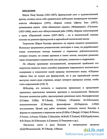 ШБодлер, его личность и творчество привлекали и продолжают привлекать пристальное внимание критиков и исследователей. Написано большое количество работ, преследующих различные цели: биографические (J.Crepet; G.Blin; W.T.Bandy, CPichois; J.Pommier; М.Л.Нольман), психологические (C.Mauron), философские (G.Dupeyron; A.Hirt) исследования. Целый ряд работ посвящен личности самого Бодлера и формам ее отражения в творчестве поэта (G.Blin; C.Borgal; J.Crepet; R.Denux; F.Ferran; A.Fumet; G.Kahn; C.Mauclaire; M.Ruff; P.Trahard; И.И.Карабутенко; В.В.Левик; М.ЛНольман; А.Савинио; О.Тимашева и др.).