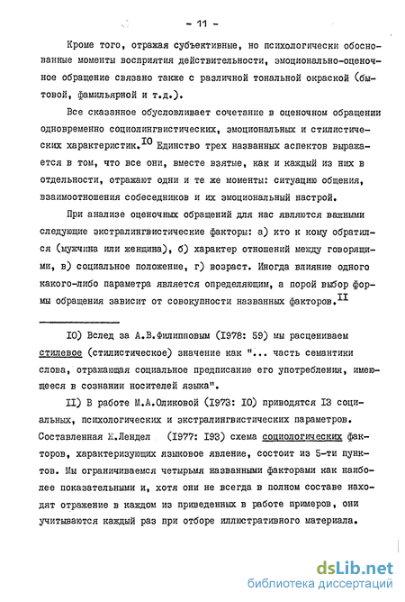 11) В работе М.А.Оликовой (1973: 10) приводятся 13 социальных, психологических и экстралингвистических параметров. Составленная Ж.Лендел (1977: 193) схема социологических факторов, характеризующих языковое явление, состоит из 5-ти пунктов. Мы ограничиваемся четырьмя названными факторами как наиболее показательными и, хотя они не всегда в полном составе находят отражение в каждом из приведенных в работе примеров, они учитываются каждый раз при отборе иллюстративного материала.