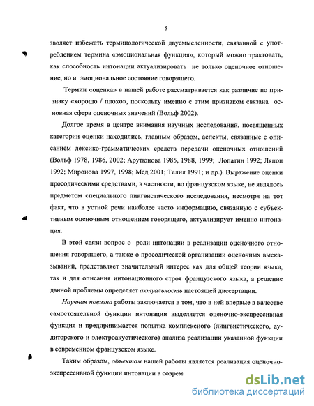 Долгое время в центре внимания научных исследований, посвященных категории оценки находились, главным образом, аспекты, связанные с описанием лексико-грамматических средств передачи оценочных отношений (Вольф 1978, 1986, 2002; Арутюнова 1985, 1988, 1999; Лопатин 1992; Ляпон 1992; Миронова 1997, 1998; Мед 2001; Телия 1991; и др.). Выражение оценки просодическими средствами, в частности, во французском языке, не являлось предметом специального лингвистического исследования, несмотря на тот факт, что в устной речи наиболее часто информацию, связанную с субъективным оценочным отношением говорящего, актуализирует именно интонация.