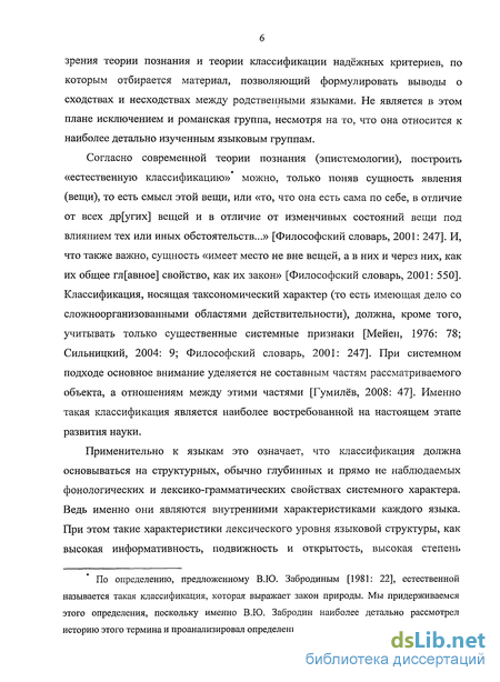 Возвращаясь к романским языкам, следует отметить, что до сих пор степень их родства определялась главным образом либо на основе случайных признаков [Бородина, 1977; Сергиевский, 1946; Alonso, 1978; Bartoli, 1925; Diez, 1882; Fuchs, 1849; Hall Jr., 1950; Pei, 1949; Pohl, 1965; Togeby, 1968; Wartburg, 1939], либо с применением недостаточно репрезентативного языкового материала [Manczak, 1996; Stein, 1989], либо с использованием недостаточно строгих квантитативных методов [Кромер, 2005; Новак, 1966; Contreras, 1963; Embleton, 1986; Francescato, 1980; Kempgen, 1980; Muljacic, 1967; Rea, 1958; Sores, 1989]. В тех работах по классификации романских языков, в которых таких недостатков не обнаруживается, используются либо нелексические критерии [Grimes, 1959; Iliescu, 1969; Madonia, 1979; Miiller, 1971; Renzi, 1973; Richman, 1966], либо только лексико-семантический критерий, без учёта означающего лексического знака [Guiter, 1994; Klein, 1997].