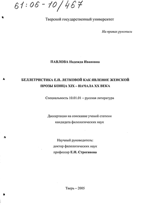 21 Таким образом, актуальность изучения художественного творчества Е. Летковой обусловлена его неизученностью, и наиболее продуктивным представляется анализ литературного наследия писательницы в контексте произведений наиболее популярных беллетристок конца XIX — начала XX в., что, на наш взгляд, позволит создать наиболее целостное представление о творчестве Летковой. Такой подход обусловлен стремлением к объективному и всестороннему изучению закономерностей историко-литературного процесса, в котором женское литературное творчество составляет весьма существенное звено. Сложность включения творчества Е. Летковой в парадигму женской прозы конца XIX - начала XX вв. состоит в том, что литературное наследие подавляющего большинства писательниц, как уже было отмечено ранее, до сих пор также остается неизученным.