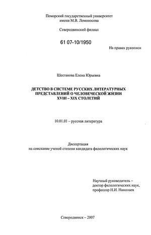 Работа строится преимущественно на литературном и публицистическом материале значительного исторического периода (XVIII - XIX века), что само по себе тоже свидетельствует о некоторой новизне подходов к изучаемой теме. Характер исследуемого историко-литературного материала определил структуру диссертации, первая глава которой посвящена выявлению представлений о детстве в русском литературном сознании XVIII века, а вторая обращена к концепции детства и ее художественному воплощению в русской литературе XIX столетия.