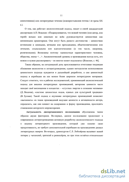 Актуальность диссертационного исследования обусловлена двумя факторами. Во-первых, драматургия С.Л. Лобозёрова, вызывая живой интерес у читателей, зрителей и режиссеров, будучи поставленной на сценах многих городов России, является на сегодняшний день практически не изученной. До сих пор не определены основные черты «театра Лобозёрова», не составлена типология лобозеровских героев, не изучены в полной мере жанровое своеобразие его произведений, особенности конфликта и сюжета. Во-вторых, в рамках данного исследования возможно продолжение разработки аксиологического подхода к анализу литературного