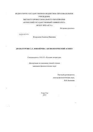 Предмет исследования: своеобразие типологии героя, жанро-во-композиционных решений в драматургии С.Л. Лобозёрова в свете ценностных представлений автора.