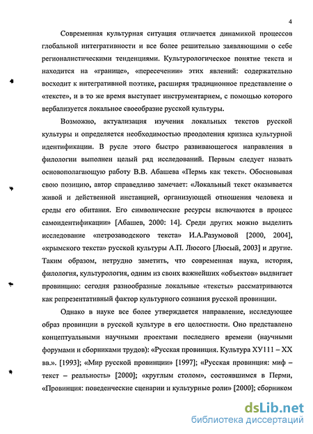 Однако в науке все более утверждается направление, исследующее образ провинции в русской культуре в его целостности. Оно представлено концептуальными научными проектами последнего времени (научными форумами и сборниками трудов): «Русская провинция. Культура ХУ111 - XX вв.». [1993]; «Мир русской провинции» [1997]; «Русская провинция: миф -текст - реальность» [2000]; «круглым столом», состоявшимся в Перми, «Провинция: поведенческие сценарии и культурные роли» [2000]; сборником