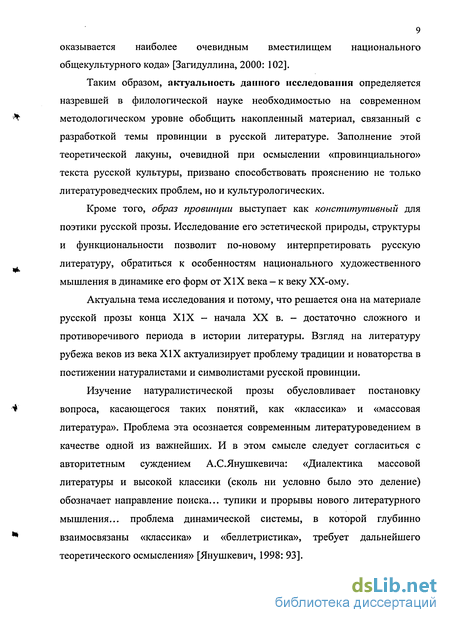 Таким образом, актуальность данного исследования определяется назревшей в филологической науке необходимостью на современном методологическом уровне обобщить накопленный материал, связанный с разработкой темы провинции в русской литературе. Заполнение этой теоретической лакуны, очевидной при осмыслении «провинциального» текста русской культуры, призвано способствовать прояснению не только литературоведческих проблем, но и культурологических.