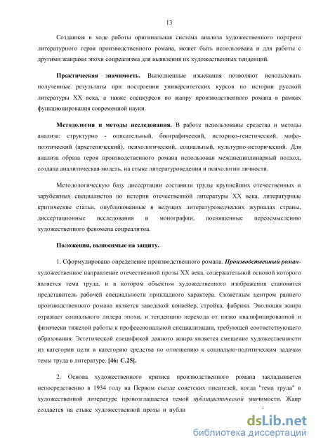 Методология и методы исследования. В работе использованы средства и методы анализа: структурно - описательный, биографический, историко-генетический, мифо-поэтический (архетепический), психологический, социальный, культурно-исторический. Для анализа образа героя производственного романа использован междисциплинарный подход, создана аналитическая модель, на стыке литературоведения и психологии личности.