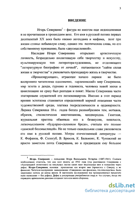 Игорь Северянин - псевдоним Игоря Васильевича Лотарёва (1887-1941). Считаем необходимым отметить, что сам поэт вплоть до 1912 года {год расставания Северянина с «Ассоциацией эгопоэзии») на титульных листах своих книг подписывал имя и псевдоним через дефис: Игорь-Северянин, понимая приложение как второе имя (пришелец с Севера), а не фамилию. Читатели восприняли наименование «Северянин» как фамилию, что впоследствии было закреплено поэтом до конца жизни. В настоящем исследовании мы придерживаемся принятого ныне написания — без дефиса. Дефис в диссертации употребляется лишь в тех случаях, когда это оправдано временными рамками создания того или иного сборника.