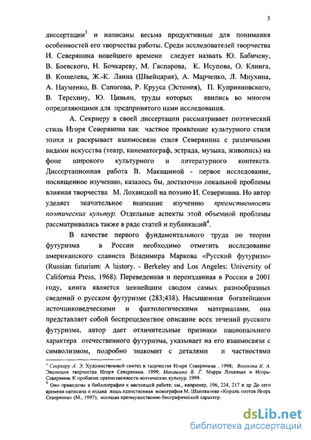 А. Секриеру в своей диссертации рассматривает поэтический стиль Игоря Северянина как частное проявление культурного стиля эпохи и раскрывает взаимосвязи стиля Северянина с различными видами искусства (театр, кинематограф, эстрада, музыка, живопись) на фоне широкого культурного и литературного контекста. Диссертационная работа В. Макашиной - первое исследование, посвященное изучению, казалось бы, достаточно локальной проблемы влияния творчества М. Лохвицкой на поэзию И. Северянина. Но автор уделяет значительное внимание изучению преемственности поэтических культур. Отдельные аспекты этой объемной проблемы рассматривались также в ряде статей и публикаций4.
