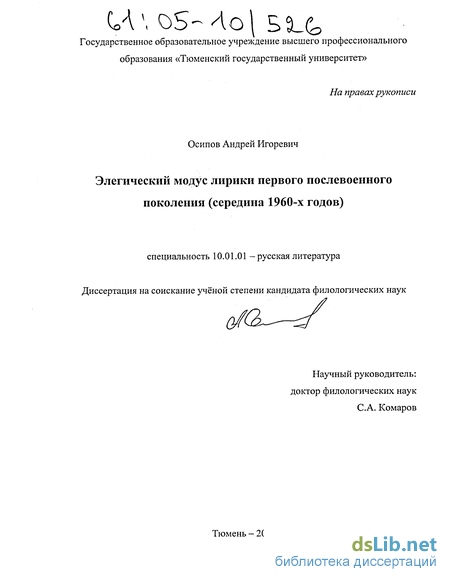 Цель работы - систематическое детальное описание элегического модуса лирики середины 1960-х годов поэтов первого послевоенного поколения.