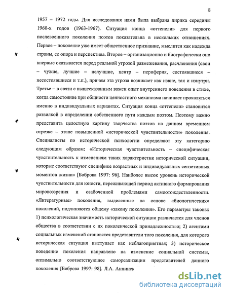 Хронологические рамки 1960-х достаточно условны. Так, на сайте «Поэзия 1960-х как гипертекст», получившем премию «Малый букер», указаны 1957 - 1972 годы. Для исследования нами была выбрана лирика середины 1960-х годов (1963-1967). Ситуация конца «оттепели» для первого послевоенного поколения поэтов показательна в нескольких отношениях. Первое - поколение уже имеет общественное признание, мыслится как надежда страны, ее опора и перспектива. Второе - организационно и биографически оно впервые оказывается перед реальной угрозой размежевания, расчленения (свои - чужие, лучшие - нелучшие, центр - периферия, состоявшиеся -несостоявшиеся и т.п.), причем эта угроза возникает как извне, так и изнутри. Третье - в связи с вышесказанным важен опыт внутреннего поведения в стихе, когда самостояние при общности ценностного механизма начинает проявляться именно в индивидуальных вариантах. Ситуация конца «оттепели» становится развилкой в определении собственного пути каждым поэтом. Поэтому важно представить целостную картину творчества поэтов на данном временном отрезке - этапе повышенной «исторической чувствительности» поколения. Специалисты по исторической психологии определяют эту категорию следующим образом: «Историческая чувствительность - специфическая чувствительность к изменениям таких характеристик исторической ситуации, которые соответствуют специфике возрастных и индивидуальных сензетивных моментов жизни» [Боброва 1997: 96]. Наиболее высок уровень исторической чувствительности для юности, переживающей период активного формирования мировоззрения и озабоченной проблемами самоотождествленности. «Литературные» поколения, выделенные на основе «биологических» поколений, подчиняются общему «закону поколения». Его параметры таковы: 1) психологическая значимость исторической ситуации различается для членов общества в соответствии с их поколенческой принадлежностью; 2) агентами социальных изменений становятся представители того поколения, для которого историческая ситуация выступает как неблагоприятная; 3) историческое поведение поколения направлено на изменение социальной системы, оптимально соответствующее самореализации представителей данного поколения [Боброва 1997: 98]. Л.А. Аннинский так сформулировал ощущение своего поколения: «...раннее сиротство, позабытое за ранними заботами, навсегда вошло в наш духовный состав и ... оно еще много раз будет оплакано нами, ибо нельзя прожить другое детство, чем то, что тебе досталось, а надобно только, чтобы в какой-то момент отодвинулась пелена каждодневных забот и обнажилась истина судьбы, и драма ее встала во весь рост» [Аннинский 1991: 9]. Типологически схожее явление отмечают специалисты в «деревенской прозе»: «Анализ англо-американских исследований по «деревенской прозе» позволяет выделить следующие идентификационные доминанты: утрата идеала и обусловленный ею поиск символа на глубинных ментальных уровнях; ситуация исчезновения нравственных и культурных ценностей, открывающая перспективу на «старую Россию» и ее тысячелетнюю историю; типологическая оппозиция крестьянского менталитета и официальной идеологии» [Большакова 1996: 6].