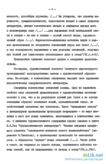 Понятие "контекст" не является новым для науки о литературе. Как известно, "...слово "контекст" обрело в гуманитарных науках второе, переносное значение, ...Оно используется в этом ово-ем новом смысле, как некое связанное целое /.../, во многом определяющее природу и сущность каждой из входящих в него частей. /.../. Это общий принцип познавательного рассмотрения одного элемента в его отношении к взаимодействующей о ним совокупности других элементов, составляющих определенную систему*.."/39,с.244/.