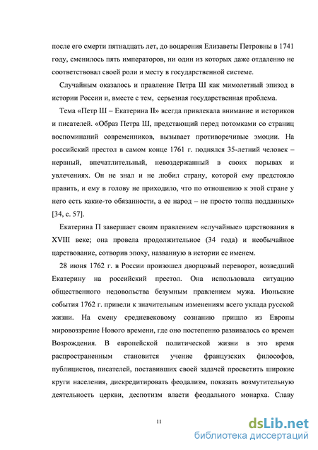 Тема «Петр Ш – Екатерина II» всегда привлекала внимание и историков и писателей. «Образ Петра Ш, предстающий перед потомками со страниц воспоминаний современников, вызывает противоречивые эмоции. На российский престол в самом конце 1761 г. поднялся 35-летний человек – нервный, впечатлительный, невоздержанный в своих порывах и увлечениях. Он не знал и не любил страну, которой ему предстояло править, и ему в голову не приходило, что по отношению к этой стране у него есть какие-то обязанности, а ее народ – не просто толпа подданных» [34, с. 57].
