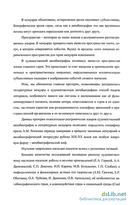 Данные критерии относительно разграничения жанров художественной автобиографии и литературных мемуаров позволяют определить специфику прозы A.M. Ремизова периода эмиграции в процессе эволюции мемуарной и автобиографической литературы рубежа XIX-XX веков как особую жанровую форму - автобиографический миф.