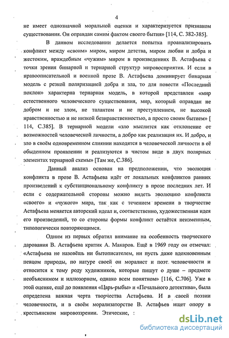 В заключении подводятся итоги исследования и делается вывод о творческой эволюции В. Астафьева как движения от тернарной структуры «естественной» жизни и локальных конфликтов «своего» и «чужого» мира к бинарной оппозиции добра и зла и субстанциональному конфликту.