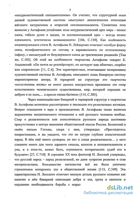 7 «натуралистический сентиментализм». Он считает, что структурной осью данной художественной системы «выступает диалогическая оппозиция жёсткого натурализма и открытой сентиментальности. Семантика этих полюсов у Астафьева устойчива: если натуралистический срез мира - полюс хаоса, гибели души и жизни, то сентиментальный срез - всегда полюс идеального, эстетически возвышенного» [106, С. 130]. Как особенность индивидуального стиля В. Астафьева Н. Лейдерман отмечает «особую форму сказа, полифонического по составу и карнавального по эстетическому пафосу, с амплитудой от безудержного смеха до трагических рыданий» [Там же, С. 103]. Об этой же особенности творчества Астафьева говорит К. Азадовский: «Он почти не резонёрствует, он негодует или обличает, скорбит или содрогается» [11, С.4]. Эти характеристики, отмечающие поляризацию художественной системы В. Астафьева, описывают лишь бинарную систему мировосприятия автора. В тернарной же структуре его творчества «естественная жизнь» не имеет данных контрастных признаков: это «мир естественного человеческого существования, мир,, который оправдан не добром и не злом,... а просто своим бытием» [114, С.385].