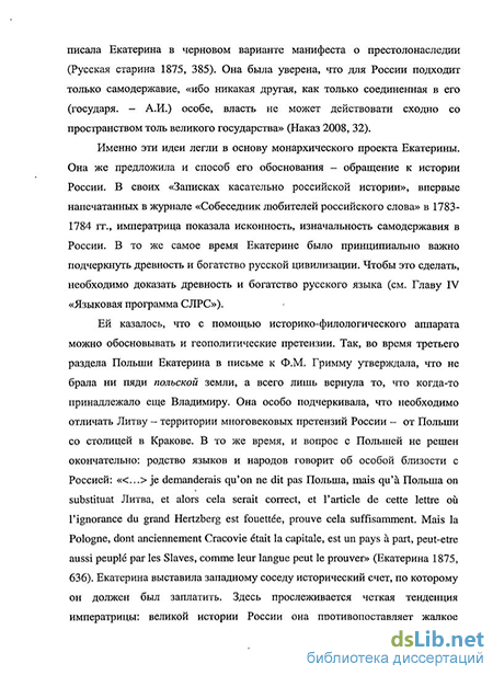 Педагогические начинания Екатерины ... служили также «основанием» для изображения ее просвещенным монархом. В этом же плане рекламировались заботы о науке и литературе. Отсюда создание Российской академии и официального журнала «Собеседник любителей российского слова» ... Правительственный журнал, для сотрудничества в котором были приглашены многие крупные писатели, должен был демонстрировать перед обществом право всех мыслить свободно» (Там же, 227-228).