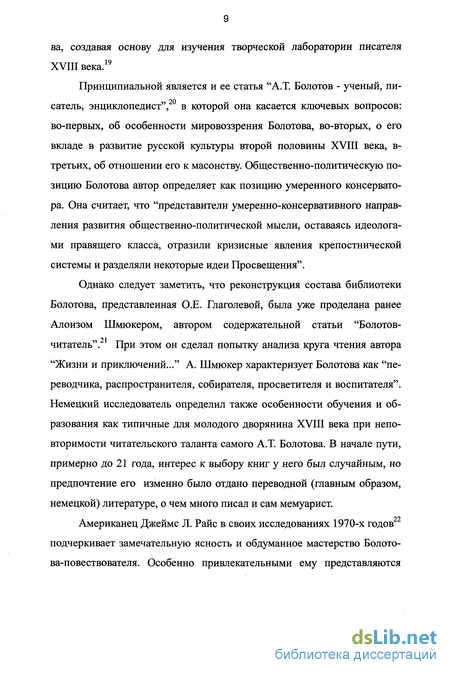 Однако следует заметить, что реконструкция состава библиотеки Болотова, представленная О.Е. Глаголевой, была уже проделана ранее Алоизом Шмюкером, автором содержательной статьи "Болотов-читатель". При этом он сделал попытку анализа круга чтения автора "Жизни и приключений..." А. Шмюкер характеризует Болотова как "переводчика, распространителя, собирателя, просветителя и воспитателя". Немецкий исследователь определил также особенности обучения и образования как типичные для молодого дворянина XVIII века при неповторимости читательского таланта самого А.Т. Болотова. В начале пути, примерно до 21 года, интерес к выбору книг у него был случайным, но предпочтение его изменно было отдано переводной (главным образом, немецкой) литературе, о чем много писал и сам мемуарист.