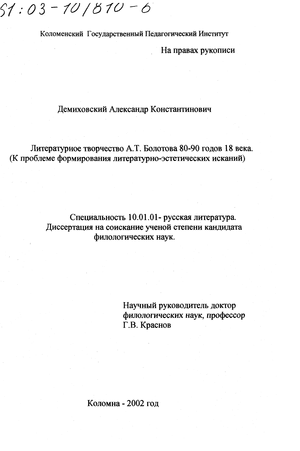 творчестве Болотова, его эстетических исканиях впервые ставится как часть большой проблемы исторического развития русской литературы в эпоху сентиментализма.